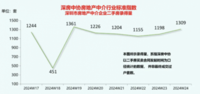 6月17日,深圳市房地產(chǎn)中介協(xié)會(huì)發(fā)布數(shù)據(jù),2024年第24周(6月10日至6月16日),深圳全市二手房成交量(含自助)錄得1309套,環(huán)比增長(zhǎng)9.3%。