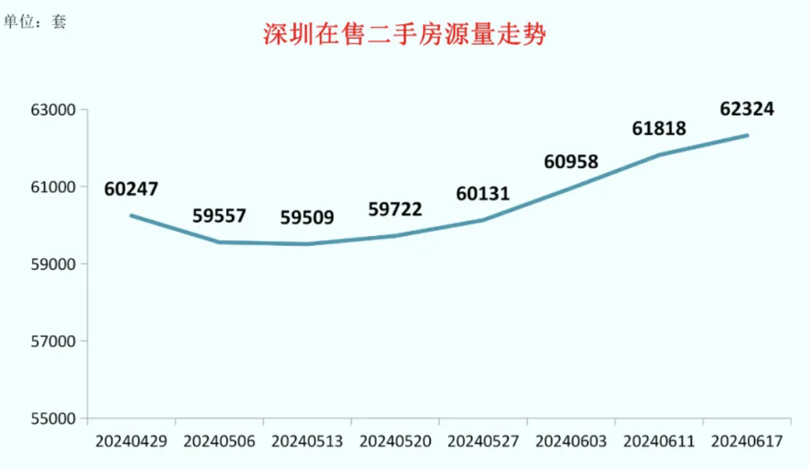 深圳市房地產(chǎn)中介協(xié)會(huì)根據(jù)公開在售二手房源量數(shù)據(jù)統(tǒng)計(jì),截至2024年6月17日,深圳全市共有62324套有效二手房源在售,較上周增加506套。