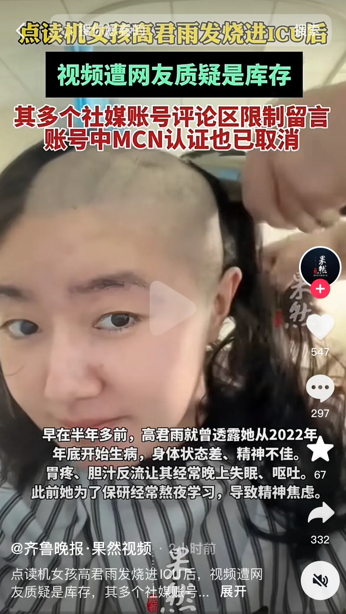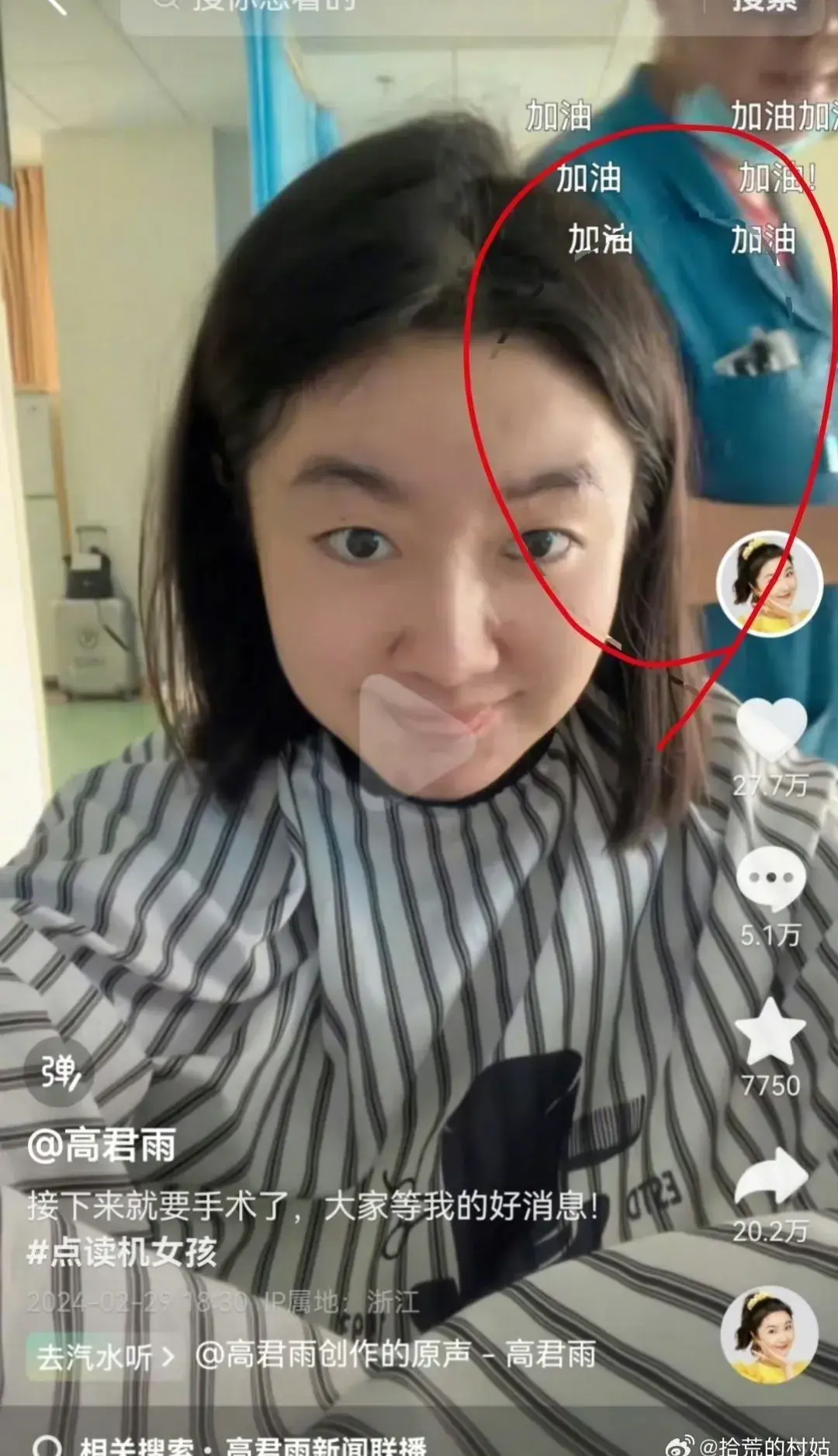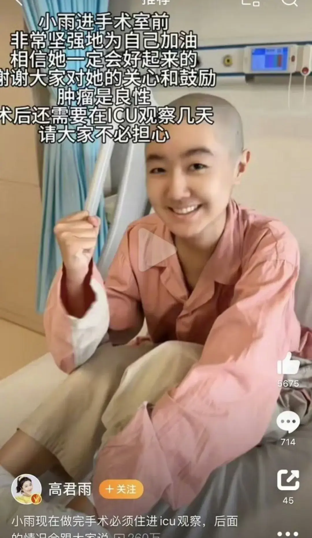 近日,“點讀機女孩”@高君雨 在其個人賬號上發布視頻稱,自己患上罕見腦瘤,隨后上傳了進手術室的過程。