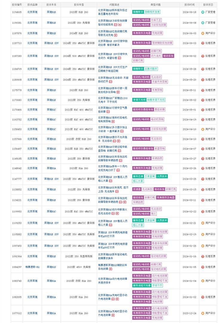 而在售后服務(wù)和產(chǎn)品質(zhì)量方面,奔馳也屢屢爆出負(fù)面新聞。早在2015年,奔馳因4S店小病大修而上過(guò)央視315晚會(huì),西安奔馳車主坐發(fā)動(dòng)機(jī)維權(quán)的事件,至今歷歷在目。而在純電動(dòng)車領(lǐng)域,問(wèn)題同樣也不少,不少用戶反映無(wú)法啟動(dòng)的問(wèn)題。而召回對(duì)奔馳來(lái)說(shuō),如今更成家常便飯,2024年過(guò)了將近一半,奔馳已經(jīng)召回了7次。