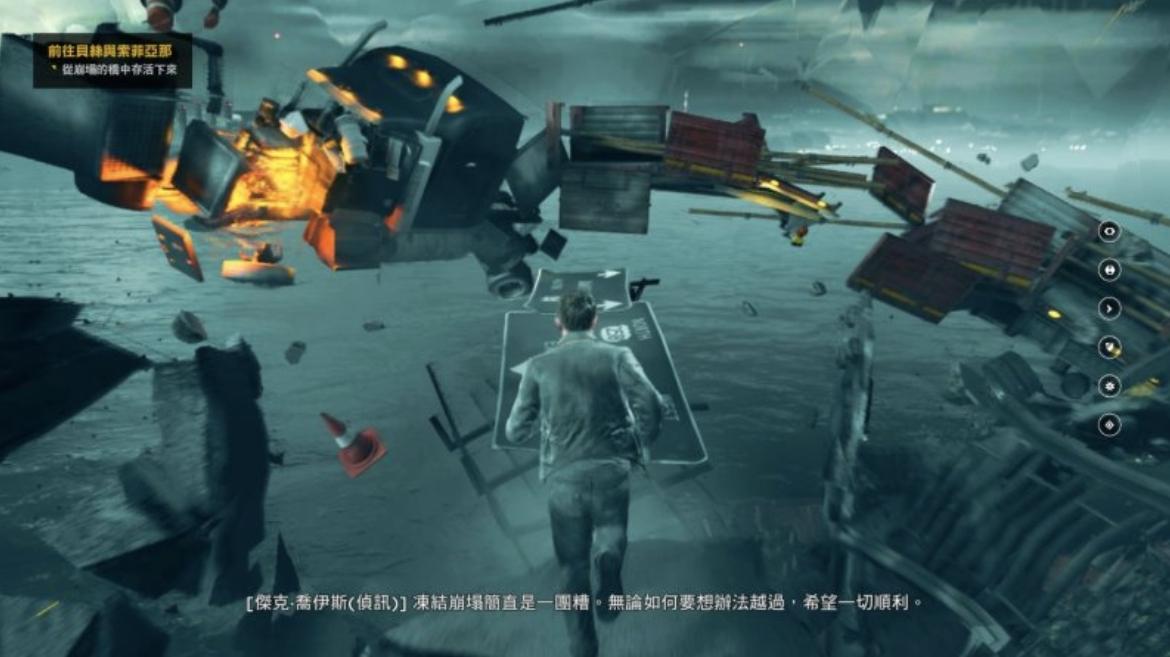 有趣的是《量子破碎》的故事氛圍并不會像《馬克思佩恩》或心靈殺手那么憂郁,這次的故事主題并不會圍繞在主角的心理行為打轉,反而是用很大的規模動作場面以及眾多的爆破來讓玩家體驗完一場時間旅行冒險,過程中也有一些較幽默風趣的對白橋段,整體風格非常陽光。
