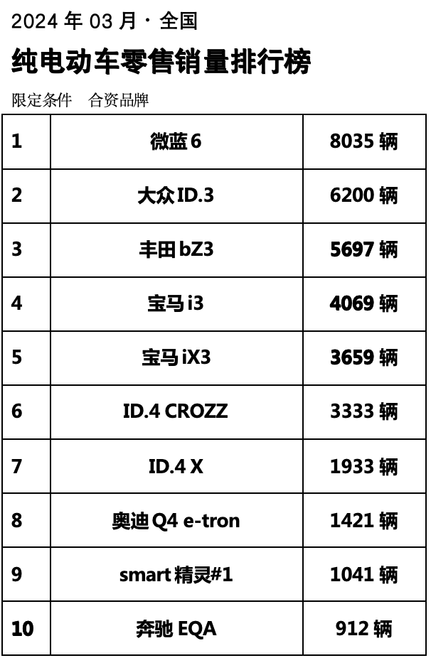 這么看來,相對于同級別、同價位純電車型來說,別克微藍(lán)6在追求價格競爭力的同時,更注重產(chǎn)品本身的綜合實(shí)力以及產(chǎn)品之外的價值和用戶實(shí)際用車體驗(yàn),從而贏得了市場的長期看好。從銷量來看,別克微藍(lán)6堪稱目前合資純電市場中的“當(dāng)紅明星”,3月零售銷量達(dá)8035輛,強(qiáng)勢登頂合資純電零售銷量排行榜。截至目前,別克微藍(lán)6已累計收獲近11萬車主的口碑,充分表明其優(yōu)異實(shí)力和卓越品質(zhì)深得市場認(rèn)可。