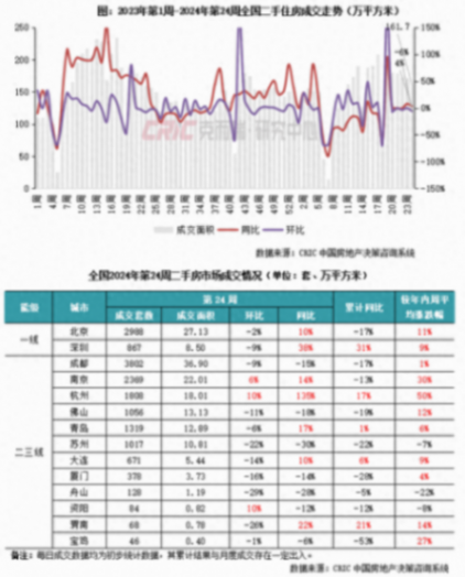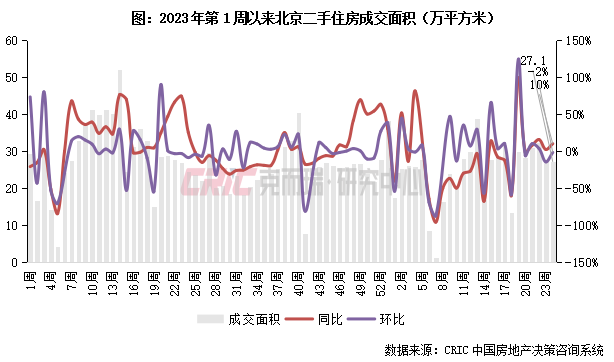 2024年第24周,北京二手房成交面積27.1萬平方米,環比下降2%,同比增長10%,較周平均增長11%。