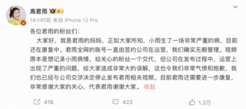 3月11日,高君雨母親通過發文回應稱,“高君雨全網的賬號一直由簽約公司在運營,但公司在發布過程中,運營上出現了嚴重的問題,給大家造成了誤解,現已決定停發相關視頻,目前君雨還需要進一步康復。”
