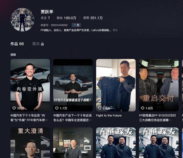 不知道大家有沒有注意到,最近賈老板在社交媒體上出現的頻率越來越高了,看來打造自身IP,用流量變現是賈躍亭的一個新思路。就在上個月,賈躍亭就曾表示“我將會開始我個人的IP商業化,盡量、盡快賺些錢,一部分還債,一部分救公司,用來補貼造車,力爭可以支撐FF的基本運營”,說白了,就是開抖音當網紅。