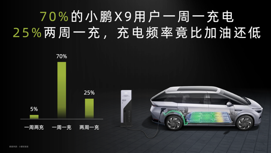 有61%的X9用戶(超6000位)有過(guò)單日行駛超過(guò)500公里的穿越經(jīng)歷,有12%的用戶走過(guò)G318、新疆、西藏、內(nèi)蒙古,70%的用戶是一周只充一次電,更有25%的用戶是兩周充一次電。也就是說(shuō),小鵬X9用戶的充電頻率接近甚至低于傳統(tǒng)燃油MPV加油的頻率,補(bǔ)能并不成為顧慮。