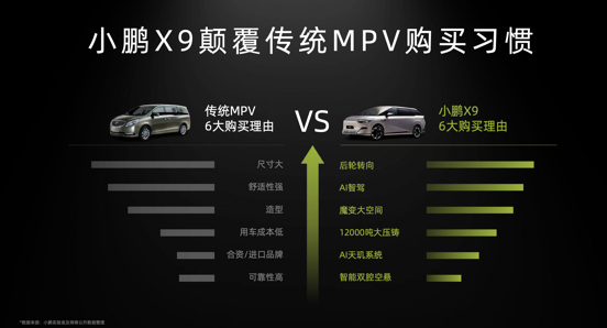 與其說(shuō)小鵬X9占據(jù)了一半的細(xì)分市場(chǎng),其實(shí)倒不如說(shuō)小鵬X9的供給為這個(gè)細(xì)分市場(chǎng)創(chuàng)造了新的需求。要問(wèn)小鵬X9為什么能夠成功,總結(jié)成一句話就是:通過(guò)獨(dú)特的產(chǎn)品定義實(shí)現(xiàn)了新物種MPV的破圈,吸引了本不屬于MPV目標(biāo)客戶的群體。