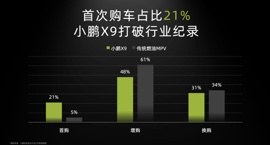 先看看客戶來(lái)源。小鵬X9有21%的客戶來(lái)自于首次購(gòu)車群體,48%來(lái)自于增購(gòu),31%來(lái)自于換購(gòu)。