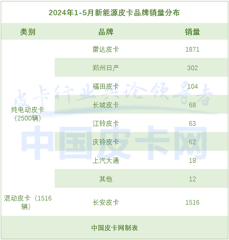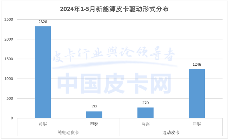 根據國產皮卡終端銷量數據顯示,2024年1-5月,新能源皮卡終端銷量為4016輛,占整體皮卡銷量的3.3%。其中,純電皮卡售出2500輛,是新能源皮卡主要銷量支撐;混動皮卡售出1516輛,值得一提的是,目前市場上可選的混動產品非常有限,但其銷量依然在短期內實現了明顯突破,可見消費者對混動皮卡的接受程度更高。