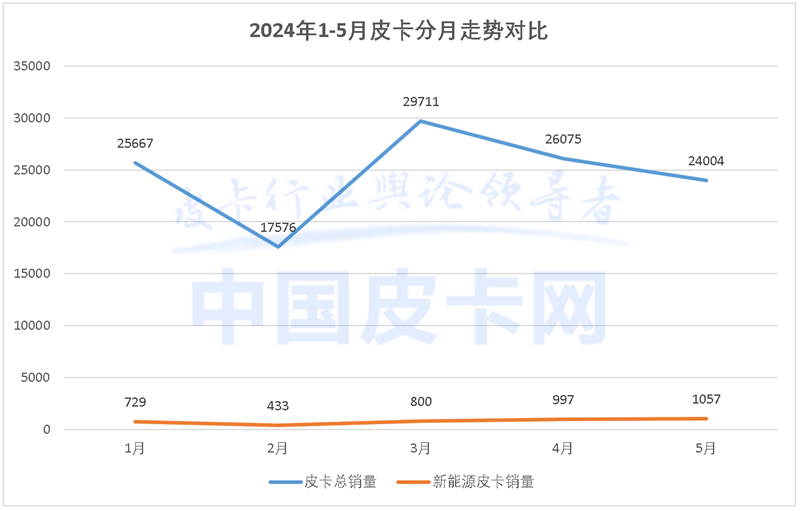 從2024年以來皮卡分月表現來看,與整體皮卡銷量的走勢不同,新能源皮卡在今年一直呈現上升曲線,且其占總銷量的比例也在逐漸提高。具體來看,1月新能源皮卡占總體皮卡銷量的比例為2.8%,3月后增長趨勢明顯,5月份新能源皮卡的市占率已經達到4.4%。盡管基數不大,但穩步提升的趨勢反映了市場對新能源皮卡的逐漸接受和偏好,而未來,隨著環保意識的提高、技術的進步和產品的豐富,預計新能源皮卡的占比會進一步提升。