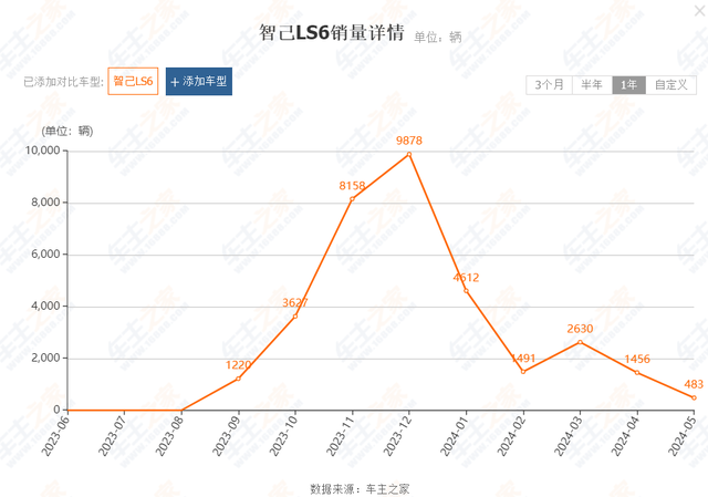 智己LS6新車2023年10月份上市,定位中大型SUV,價格22.99萬起售。自上市之日起,智己LS6因為900v高壓平臺,支持800V快充技術,3.48秒的零百加速性能,較低的定價以及出色的智駕體驗,成為當時的準爆款,多次蟬聯同級別銷冠,并且在2023年12月達到銷量最高峰,當月賣出了9878臺。