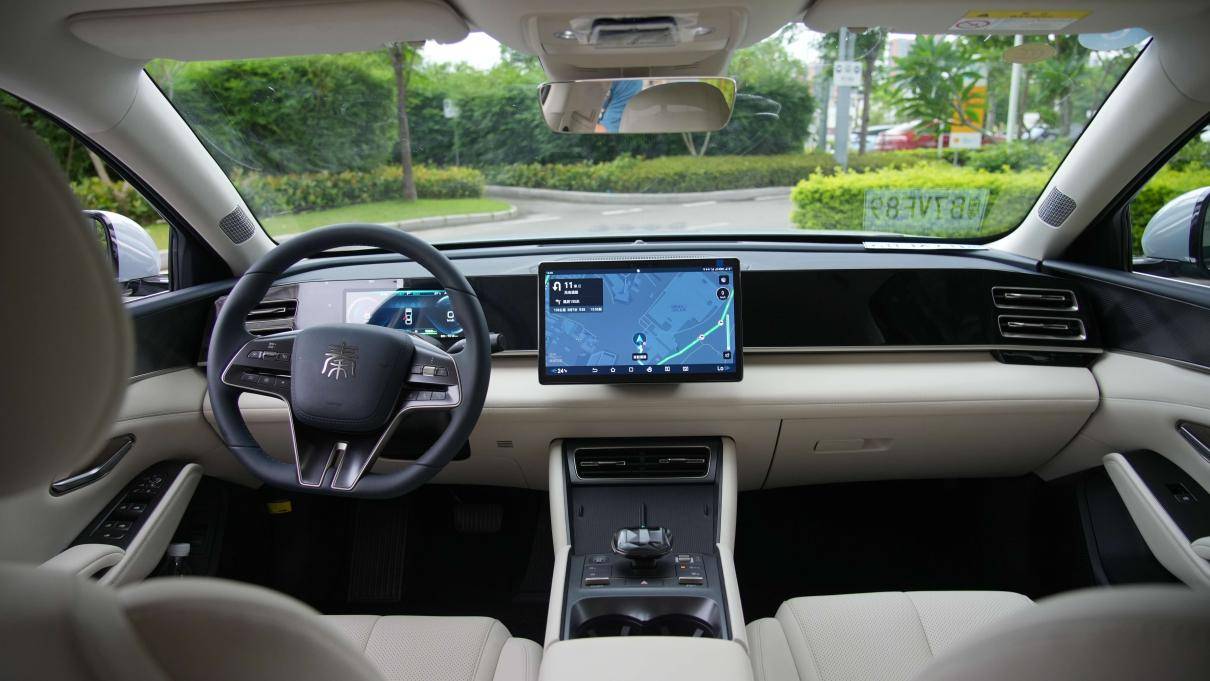 進(jìn)入車內(nèi),秦L 的座艙從中國(guó)山水畫中汲取設(shè)計(jì)靈感,以「山水畫境」為美學(xué)理念設(shè)計(jì)。主駕儀表采用了內(nèi)嵌式液晶屏,中控則為 12.8 英寸的自適應(yīng)旋轉(zhuǎn)懸浮 Pad 大屏(頂配為15.6英寸),大屏下方中控臺(tái)的空調(diào)出風(fēng)口,也巧妙地與黑色裝飾板形成一體,整體座艙風(fēng)格簡(jiǎn)約、淡雅。