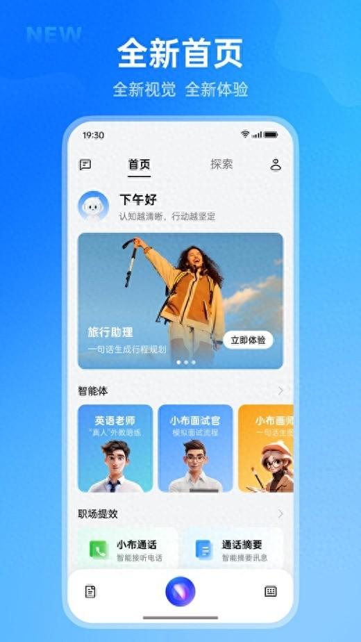 小布助手帶來全新的視覺體驗,其首頁采用圖文并茂卡片的設計,更形象地呈現AI功能和價值,幫助用戶快速了解 AI 功能;全新首頁中還設有智能體專區,通過呈現角色化的智能體,幫助用戶更直觀地理解智能體應用場景。