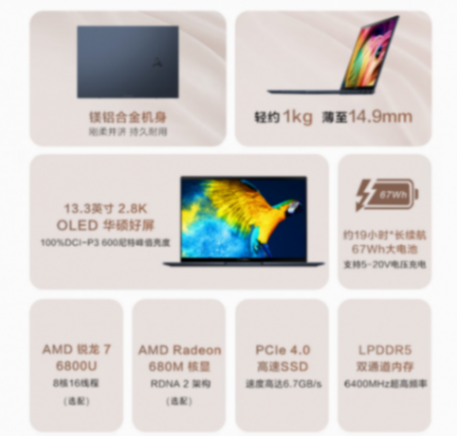 產品提供了67Wh電池,大幅增加續航力。采用鎂鋁合金機身,重量1kg,2年聯保。