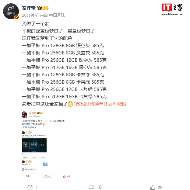 博主 @差評(píng)帝 爆料顯示,一加平板 Pro 擁有 8GB+128GB、8GB+256GB、12GB+256GB、16GB+512GB 共 4 種內(nèi)存配置版本,重量約 585g,提供深空灰、卡其綠兩種配色。