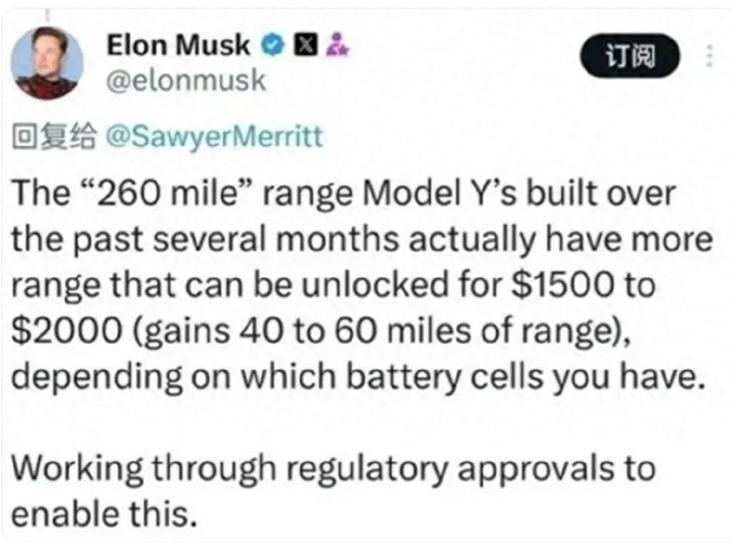 日前,車叔從相關渠道獲悉,特斯拉CEO宣稱特斯拉Model Y車主可以通過付費的方式,解鎖車輛原本隱藏的續航潛力。這也意味著如果車主付費,就可以提升整車的續航能力,對此引發了不少網友對于汽車付費訂閱功能的討論。