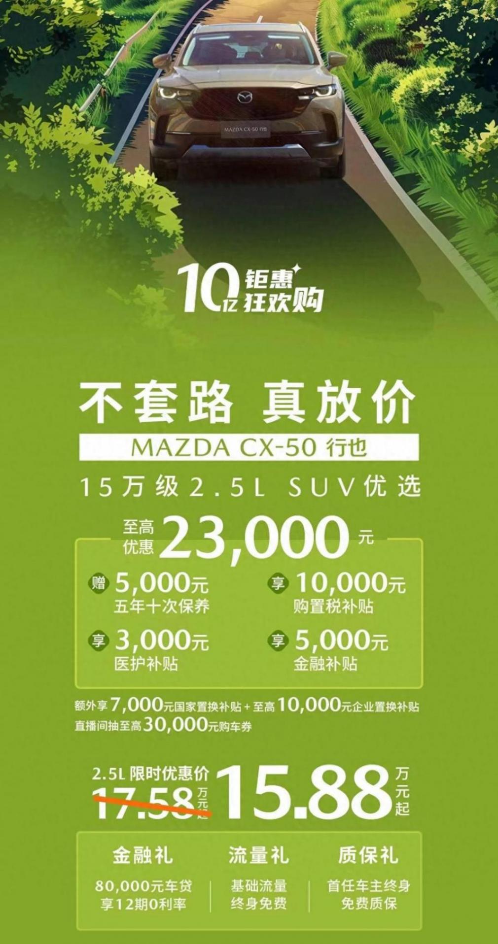 說到這次長安馬自達官方所推出的限時綜合優惠政策,簡單來說就是,只要你是在2024年5月31日之前購買長安馬自達旗下車型,即可以享受到價值5000元的五年十次保養套餐、價值5000元的商業險和交強險、10000元購置稅補貼;而針對那些需要置換的用戶,則是全系車型可享7000元國家置換補貼,同時可享至高10000元企業置換補貼。