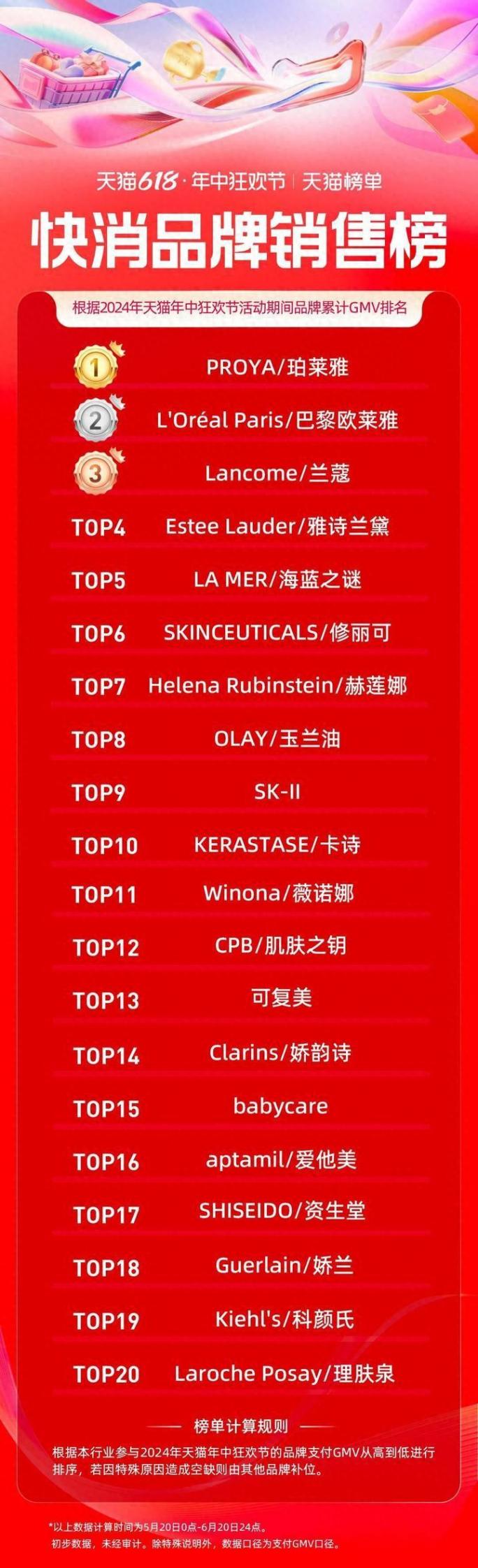 今年天貓618,美妝行業持續穩定增長,國貨新銳呈現出了強勁增長勢頭:國貨品牌 PROYA珀萊雅拿下快消品牌銷售榜冠軍。