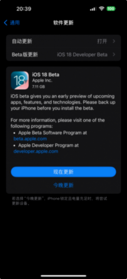 iOS 18目前還處于測試階段,大家可以嘗鮮,但不推薦主力機升級,最好等九月份的正式版,到時會在iPhone 16發售日前后推送。
