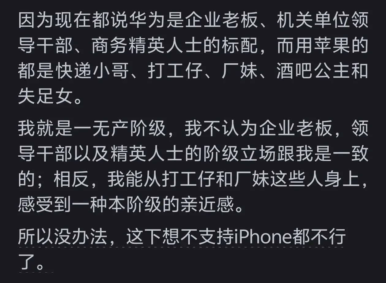 說的沒錯,本來捆綁愛國營銷就討厭了,不過還不至于讓我反感,這下好了,還玩起了職業(yè)定性,鄙視鏈,人上人,高低我都得用蘋果,還就用蘋果了