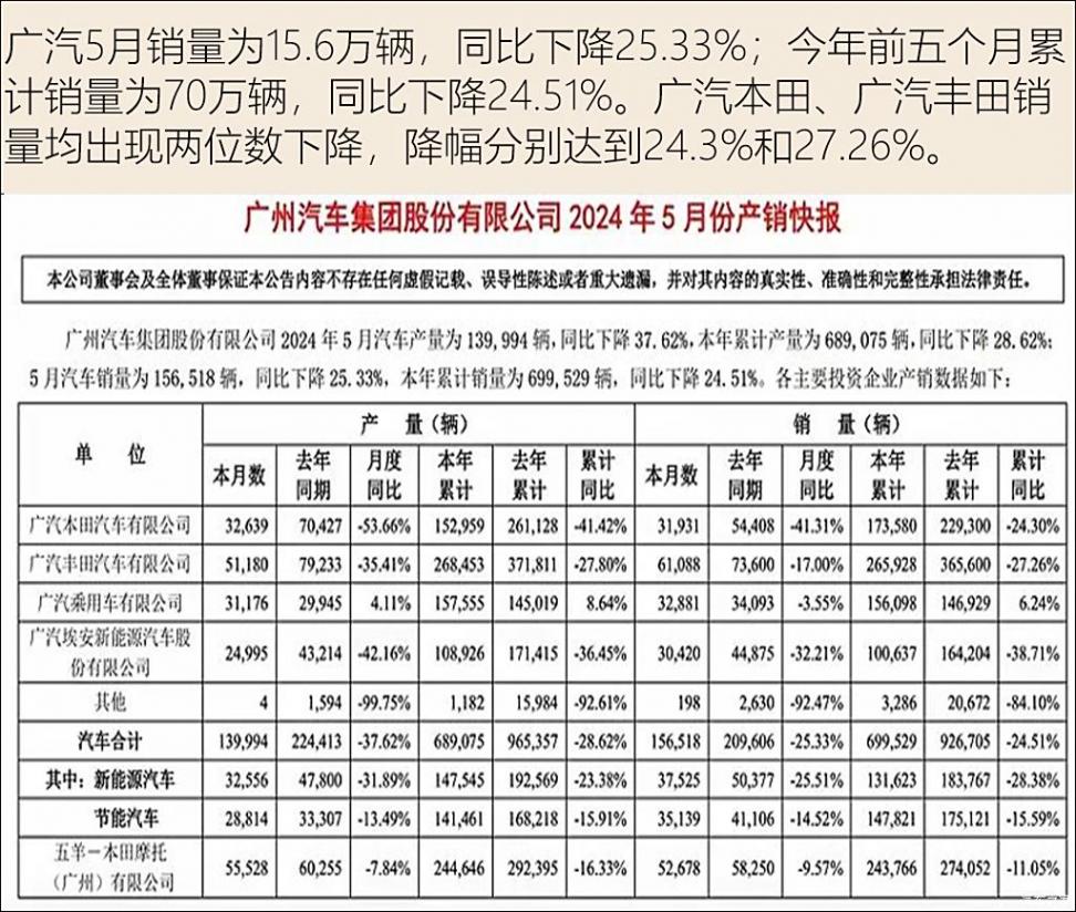 廣汽集團(tuán)5月銷量為15.6萬輛,同比下降25.33%;今年前五個月累計銷量為70萬輛,同比下降24.51%。其中,廣汽本田、廣汽豐田銷量均出現(xiàn)兩位數(shù)下降,降幅分別達(dá)到24.3%和27.26%。