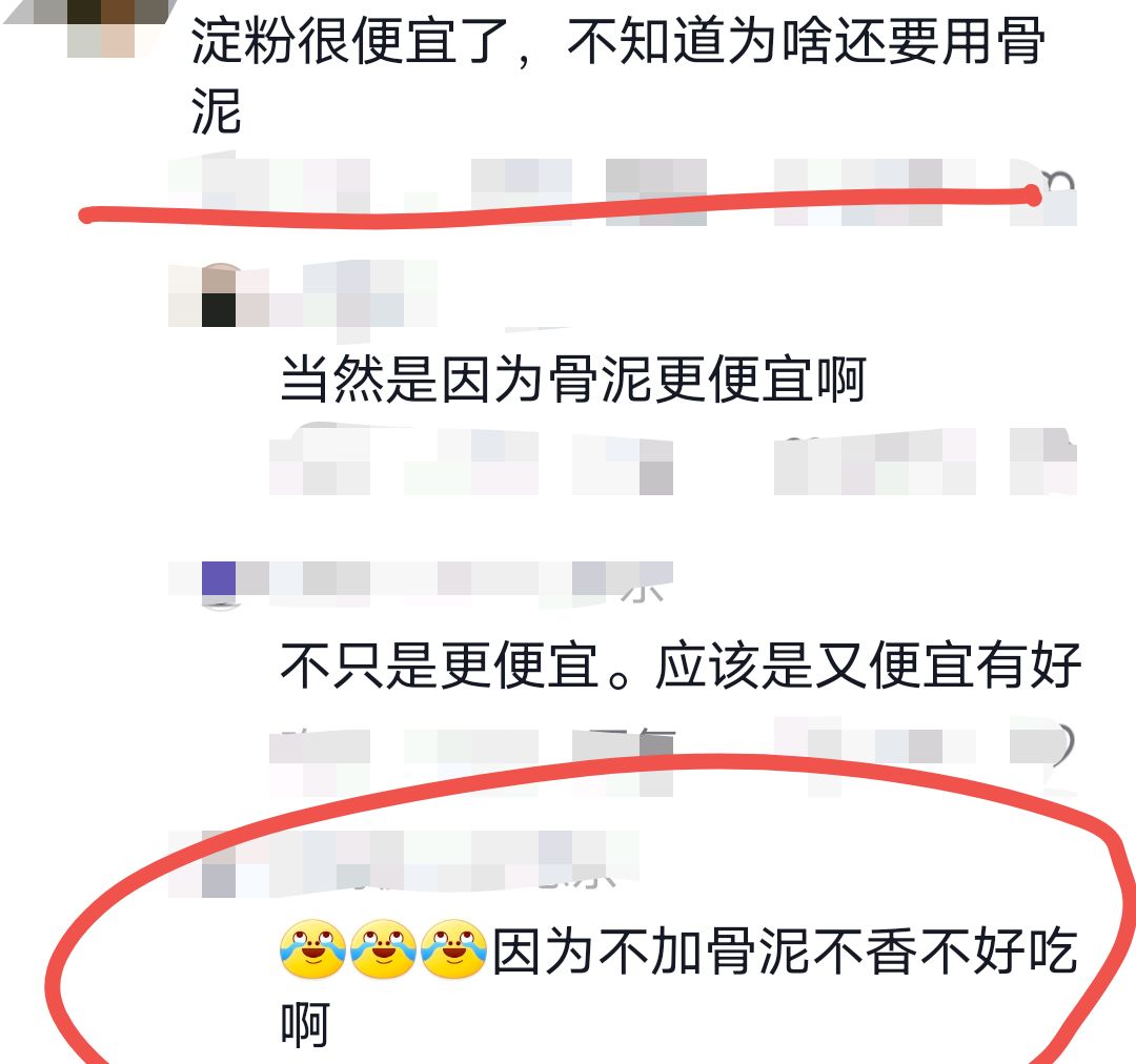 淀粉很便宜了,不知道為啥還要用骨泥,因為用了 骨泥有肉味,更好吃。