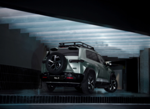 其實從側面就看到,尾部設計有些別具一格,因為傳統越野SUV的外掛式備胎在這里有兩種造型,分別是半包裹式備胎和外掛式小書包。而尾部其它設計,車頂擾流板頗具動感,尾燈組熏黑處理也提升運動氛圍。