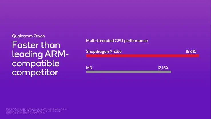 以首發驍龍X Elite的華碩無畏Pro15 高通版為例,其搭載的高通驍龍 X Elite處理器與蘋果M系列芯片一樣,為ARM平臺,采用4nm先進制程,全大核設計,整機的性能釋放高達45W,性能要比同類產品高30%。