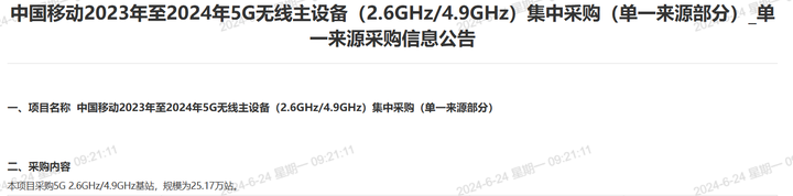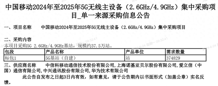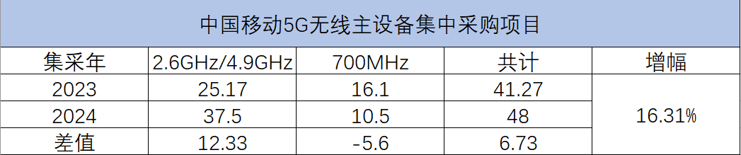 中國移動2024年至2025年5G無線主設備集中采購項目共48萬站,其中5G 2.6GHz/4.9GHz基站規模約37.5萬站,5G 700MHz基站規模約10.5萬站。