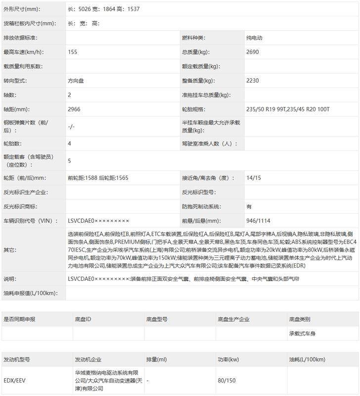 動力部分,本次完成申報的上汽大眾ID.7 S雙電機四驅版車型最大功率輸出80kW+150kW,配備三元鋰電池。此前已完成申報的單電機版車型最大功率輸出170kW。