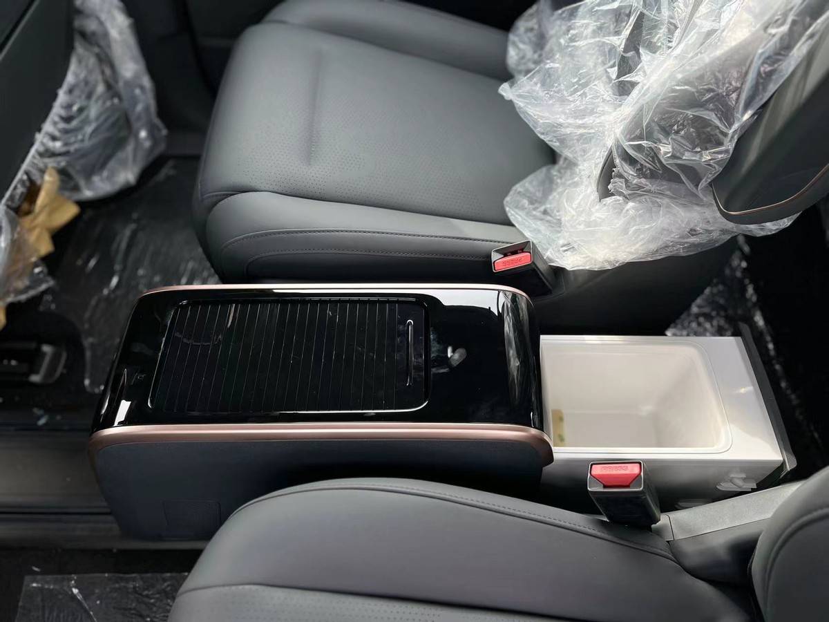 車載冰箱稱得上是一個比較聰明的設計,冰箱可以通過中央通道的滑軌從扶手箱靈活移動至二三排。冰箱上部設計有上下兩塊觸控屏,上邊可以調節座椅通風加熱及后排小憩模式,下邊可以調節冰箱,支持5℃-50℃溫度調節。三排乘客都可以隨意取用飲品,也可以當做島臺使用,非常人性化。
