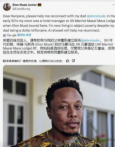 這個肯尼亞男子自稱他媽媽當時是肯尼亞馬賽馬拉某星級酒店經理,然后他說90年初期,馬斯克到訪這個酒店,意思是說他媽媽當時和馬斯克相識并且有了一段,看這肯尼亞男子膚色,他媽媽是黑人,具體是真是假,都只是一面之辭。