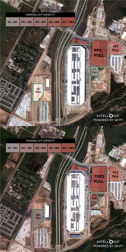 從網傳的圖片顯示,通過對比2023年10月和2024年3月的美國得克薩斯超級工廠衛星圖像,可以看出在2023年10月,得克薩斯超級工廠左下角區域的存放狀態為0%,右邊中間的停車區域是17%,到了2024年3月,這兩個區域分別為34%和97%。
