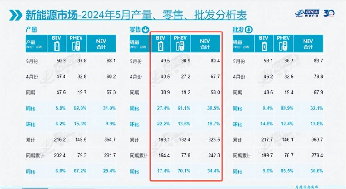 首先就是中國電動汽車市場同樣面臨著增長有限的情況。根據乘聯會的數據,2024年5月我國純電動汽車銷量為49.5萬輛,同比增長27.4%,插混車型(含增程)的銷量為30.9萬輛,同比增長61.1%,這說明相對去年而言,電動車的增速正在放緩,可油可電的PHEV車型正在成為新寵。