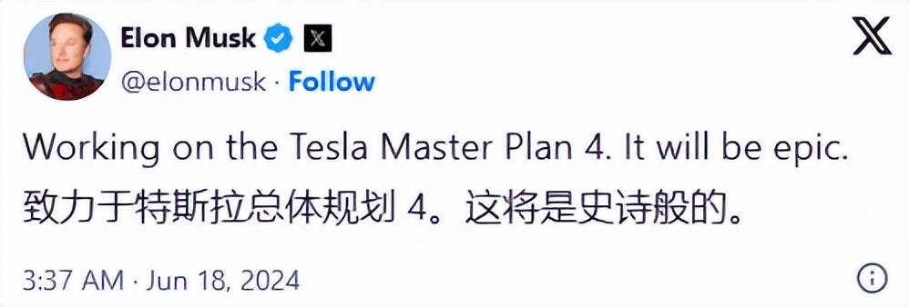 前兩條都是基于現實的市場層面,最后則是針對投資者的理想層面。近日,馬斯克在社交平臺表示,自己正在撰寫史詩般的特斯拉“秘密宏圖”第四篇章。