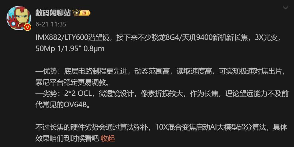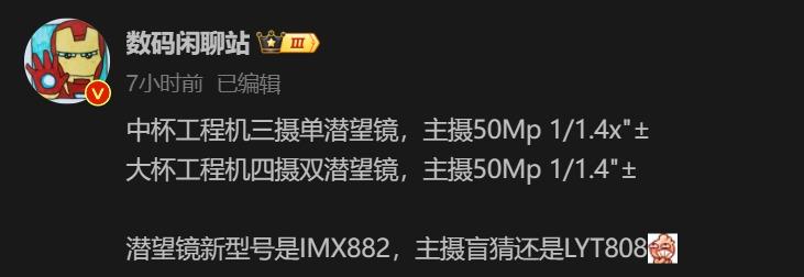 該博主還透露了新機所采用的潛望鏡頭型號為索尼IMX882傳感器,該傳感器尺寸為1/1.953英寸,單位像素面積0.8μm,支持50MP像素輸出。