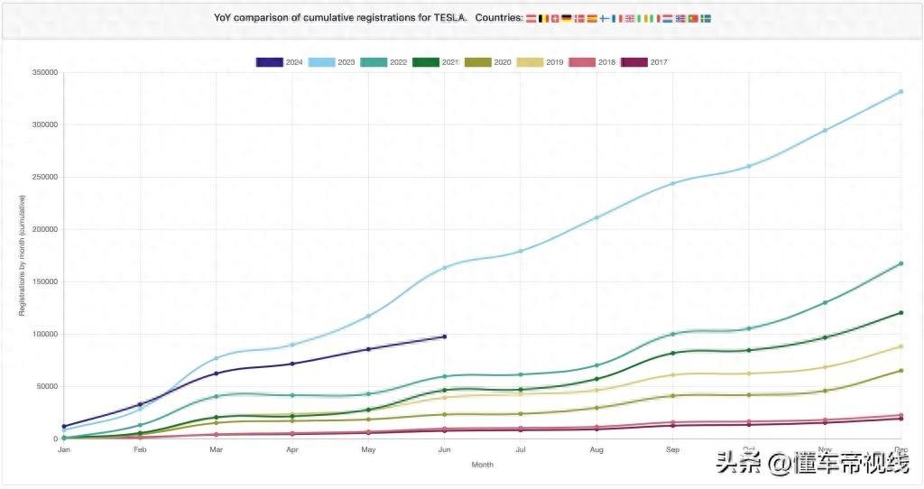 海外數(shù)據(jù)統(tǒng)計(jì)數(shù)據(jù)顯示,相比2023年創(chuàng)紀(jì)錄的一年,2024年特斯拉在歐洲市場(chǎng)交付量已經(jīng)減少6萬(wàn)多輛