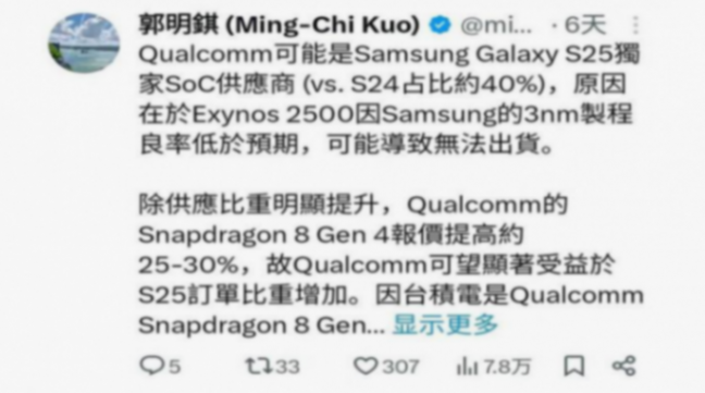 6月19日,科技圈掀起波瀾。知名分析師郭明錤在社交媒體上披露,高通將獨攬三星Galaxy S25系列的SoC供應大權。這一轉變源于三星自家Exynos 2500芯片的尷尬境地——良率遠未達到預期,導致無法如期供貨。