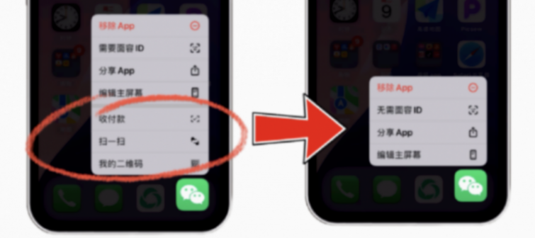 應用鎖進行升級,首先長按應用圖標后加密選項進行了漢化,另外被加密的應用部分功能快捷被隱藏,比如微信的快捷支付、掃一掃等功能。