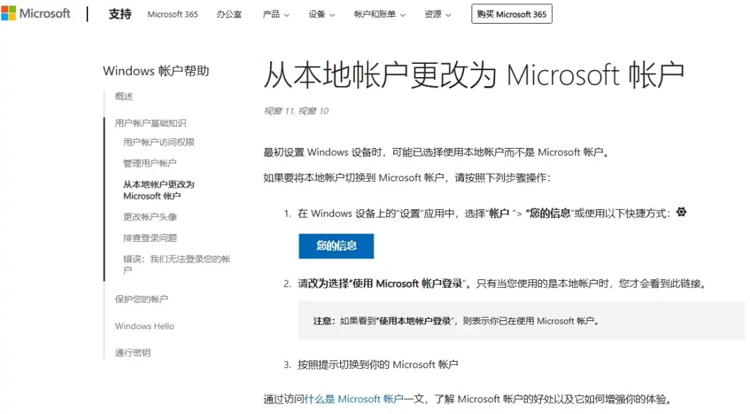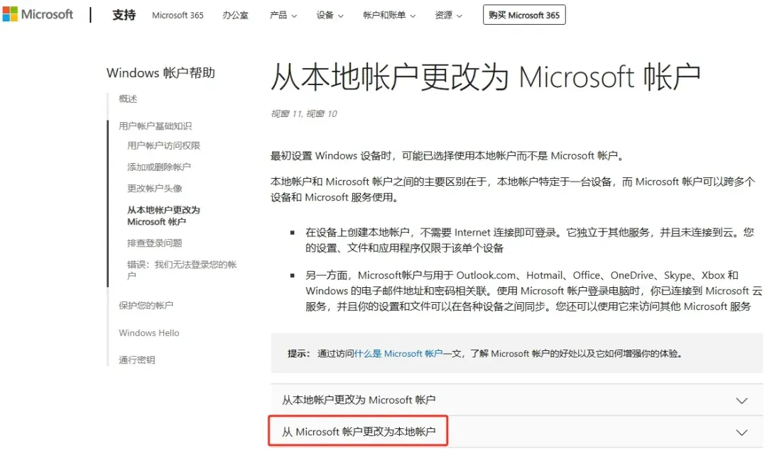 例如不久前我們還能在微軟技術支持頁面看到有關如何從 Microsoft 賬戶更改為本地賬戶的說明。