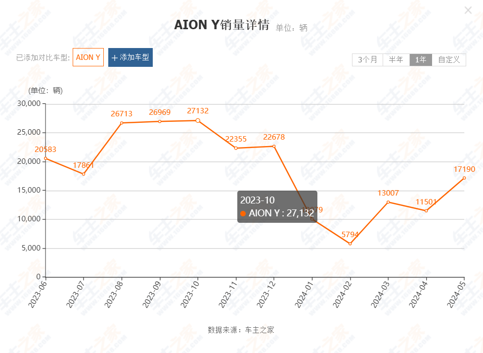 先來看AION Y。去年8~12月是這款車型的銷量高峰期,月均銷量持續保持在20000+以上,最高月銷量達到27132臺,進入2024年后,銷量斷崖式下跌,僅5月份回升至17190臺。