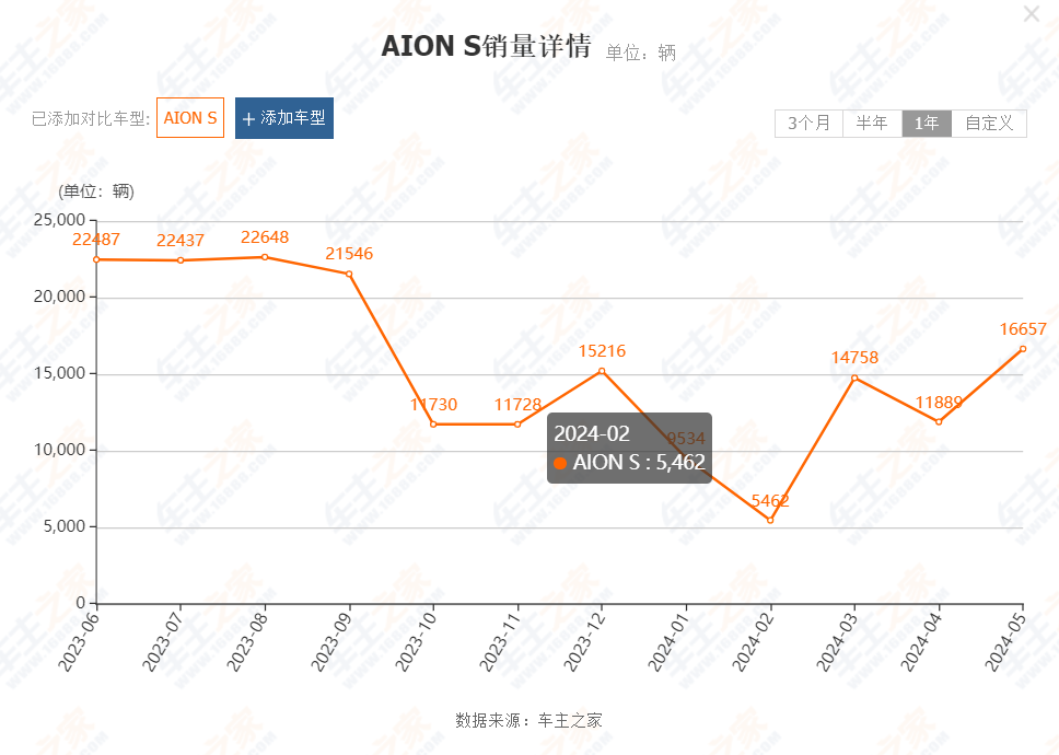 AION S的銷量趨勢與AION Y較為接近,去年3~9月份,AION S整體月銷量穩定保持在20000+,進入10月份后銷量下滑幅度加快,2024年5月份,銷量回升至16657臺。