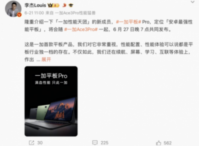 一加李杰直接在微博上隆重介紹一加平板 Pro,定位「安卓最強性能平板」,性能配置、性能體驗可以說都是平板行業(yè)獨一檔的存在。