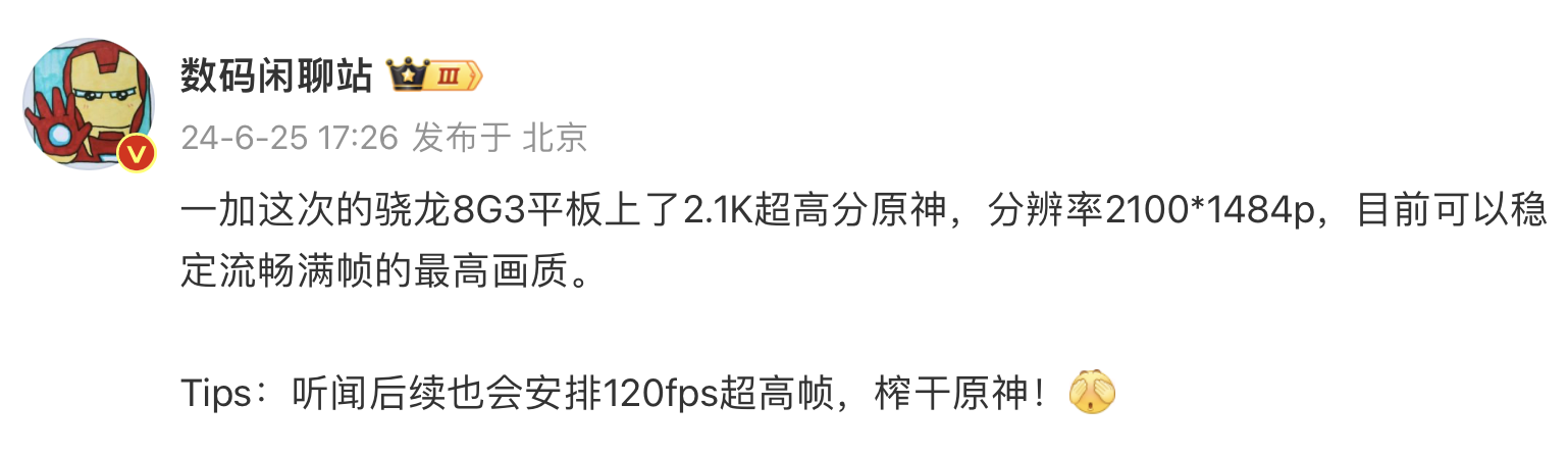 而且站哥也在微博上曝料,表示一加平板 Pro上了2.1K超高分原神,分辨率2100*1484p,目前可以穩(wěn)定流暢滿幀的最高畫質(zhì),據(jù)說后續(xù)還有120FPS超高幀模式。本來還在想,要是驍龍8Gen3遇到有散熱優(yōu)勢的平板,那游戲體驗不得嘎嘎香,果然一加是懂的,甚至連游戲體驗都用心打磨了。
