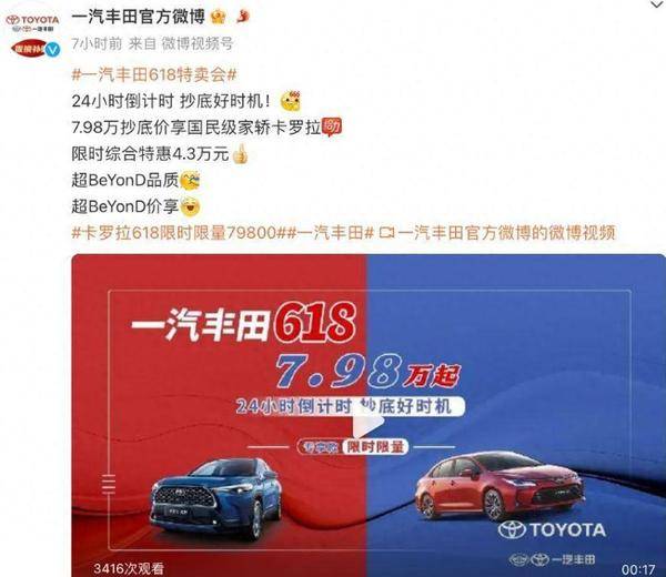每逢618,電商圈就會變得熱鬧非凡,而今年這股“降價特賣風”也吹到了汽車圈。618期間,一汽豐田官方微博發布了一則“一汽豐田618特賣會”的文章,家用轎車領域的常青樹卡羅拉限時綜合優惠4.3萬元,降至7.98萬元起,卡羅拉銳放限時優惠3萬元,起售價下探至9.98萬元。一時之間,“一汽豐田卡羅拉已不到8萬元”的詞條稱上了熱搜。