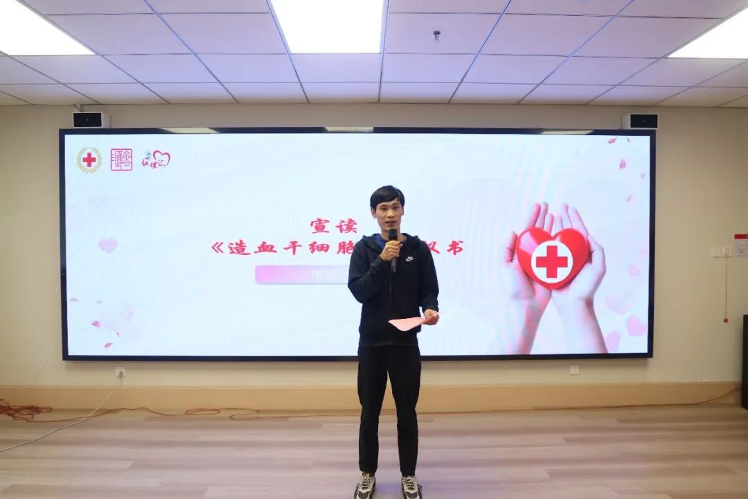 上海市第574例、奉賢區(qū)第34例、金匯鎮(zhèn)第3例造血干細(xì)胞捐獻(xiàn)者周海頻宣讀《造血干細(xì)胞》倡議書(shū)。