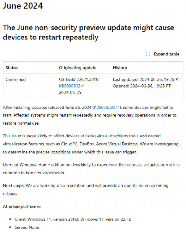 此次更新帶來了大量新功能,但同時也引入了一些新的 Bug。微軟剛剛更新了已知問題列表,確認 KB5039302 可能會導致某些設備可能無法啟動,主要表現為反復重啟。