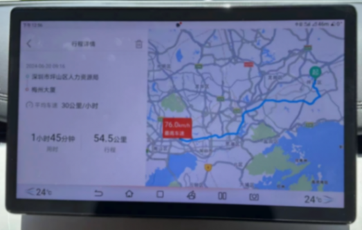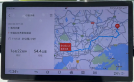 第一段行程:加油站加入1.4L 92汽油,至油箱滿到溢出的狀態。9:16開始出發,用了1小時45分(11:01)到達梅州大廈,行駛了54.5公里,最高時速在76km/h,平均時速為30km/h。