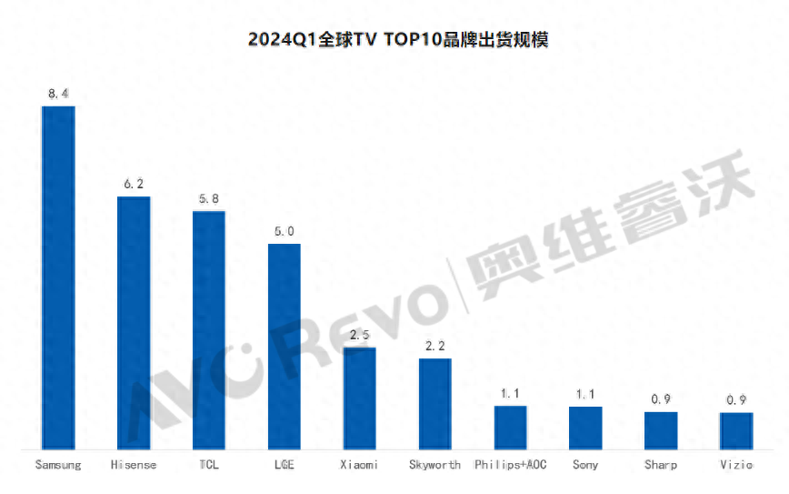 日前,奧維睿沃發(fā)布最新的《全球TV品牌出貨月度數(shù)據(jù)報告》。報告顯示,2024年一季度全球電視出貨量TOP5品牌中,三星以840萬臺排名第一,但同比下滑9.5%;中國企業(yè)占據(jù)三席,海信系電視以621萬臺的出貨量位居全球第二,TCL、LGE和小米分列三到五位。