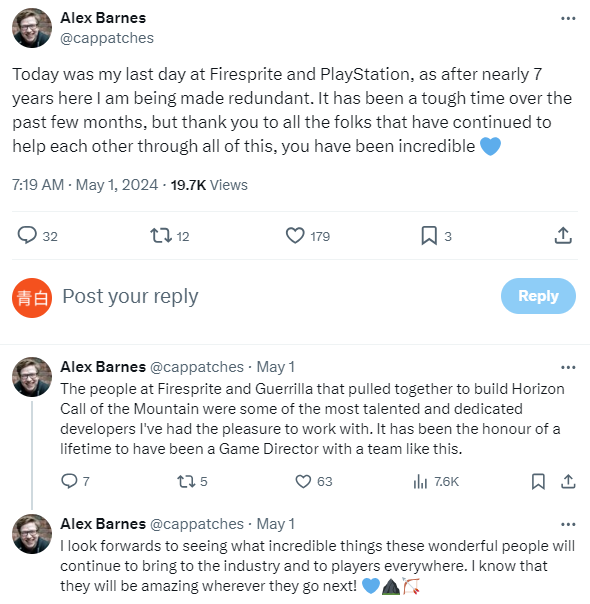 (VRPinea2024年5月8日訊)“今天是我在Firesprite和PlayStation的最后一天,因為在這里工作了近7年之后,我將被裁員。”這是五一勞動節(jié)當(dāng)天,PS VR2首發(fā)護(hù)航大作《Horizon:Call of the Mountain(地平線:山之呼喚)》的游戲總監(jiān)Alex Barnes在社交平臺的發(fā)文,宣布其已被索尼互娛解雇。“恭喜”他,這個五一能過很久了。